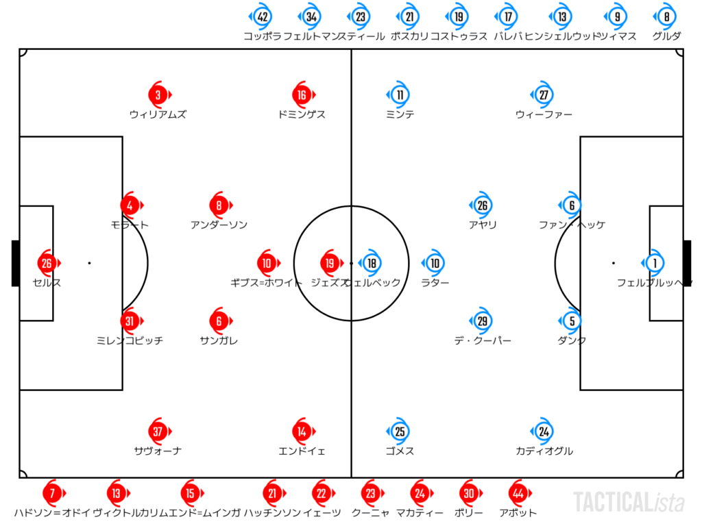 展開が落ち着くと、ボールを持つのはブライトン。前節のハーフタイムから採用し出した左サイドにデ・クーパーとカディオールを並べる形から可変成分を増やして勝負。詰まりそうになったらダンクの大きな展開から右のミンテで仕掛けるという形でボールを動かしていく。