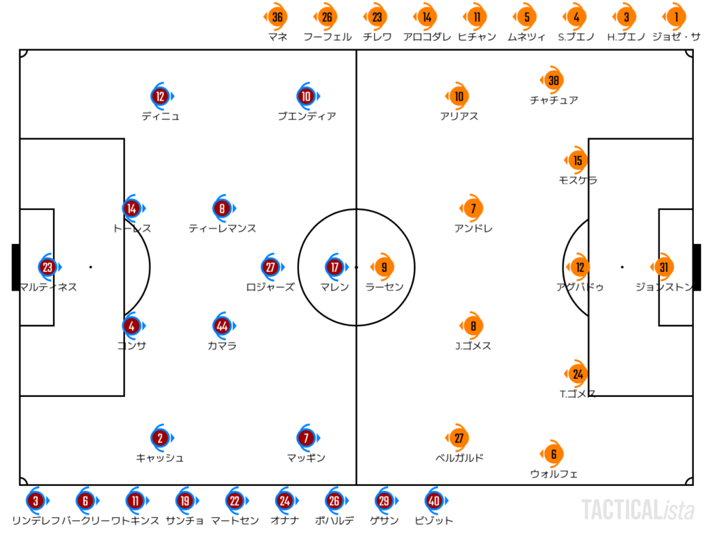 構造でやられてしまうウルブスはトランジッション局面のやり合いの方が手応えが良好であった。押し込む局面を作ったとしてもマッギンの高さを変えながら5バックと4バックを使い分けるアストンビラの布陣を崩すことができない。メリハリがある形でローブロックを組むアストンビラに対して、距離の近い細かいポゼッションからチャンスを作っていく。苦労しながら作った決定機であるモスケラのヘディングは惜しくもクロスバー。またしても先制のチャンスを活かすことができない。