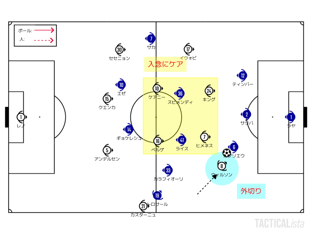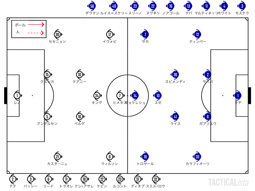 しかしながら、この変更がサイド封鎖に関して効果的だったかは微妙なところ。イウォビの守備基準がティンバーになるということは、サカのフォローにイウォビが出ていきにくいということ。ということで、サカ×セセニョンのマッチアップが増えるように。フリーマンのエゼの登場も含め、アーセナルは右サイドから少しずつリズムを作っていく。