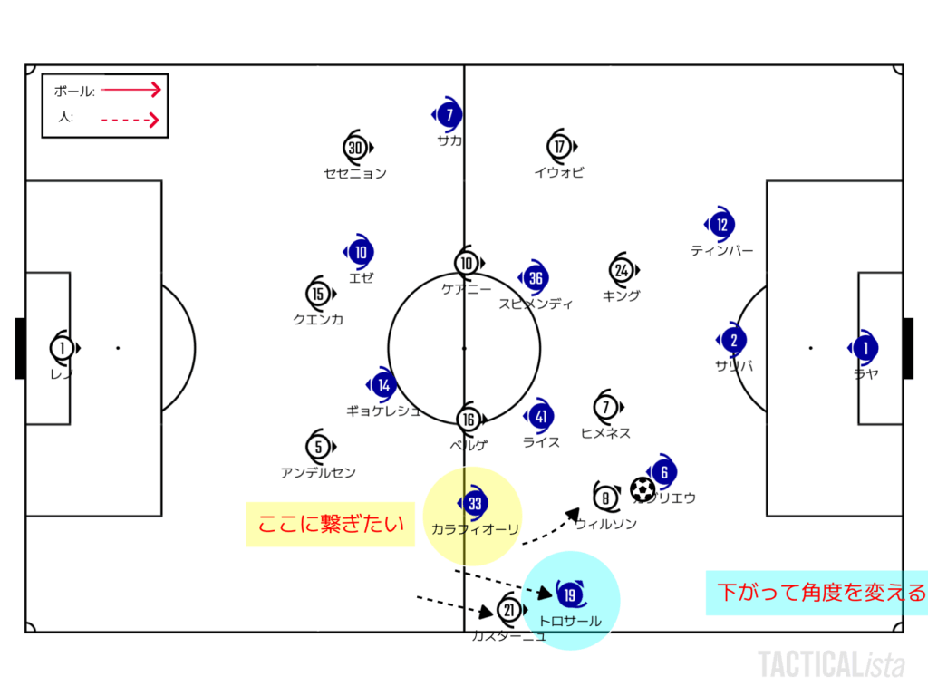 トロサール、カラフィオーリのレーン固定を前半よりも緩めた左サイドも前半よりは深い位置に入ることができるように。その結果、増えたセットプレーから先制点を奪ったアーセナル。ニアの高さのあるガブリエウのスラしをファーで待ち構えていたトロサールが押し込んでスコアを動かす。