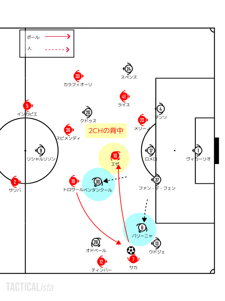 先制点以降、このスペースで暴れまわったのがエゼ。ライン間で前を向く状況は右サイドのタメによってできていたので、あとはフリーでできることを存分に発揮するため、ドリブルを挟みながらミドルゾーンでヴィカーリオを打ち抜くことで、前半のうちにアーセナルはさらなる追加点を決める。