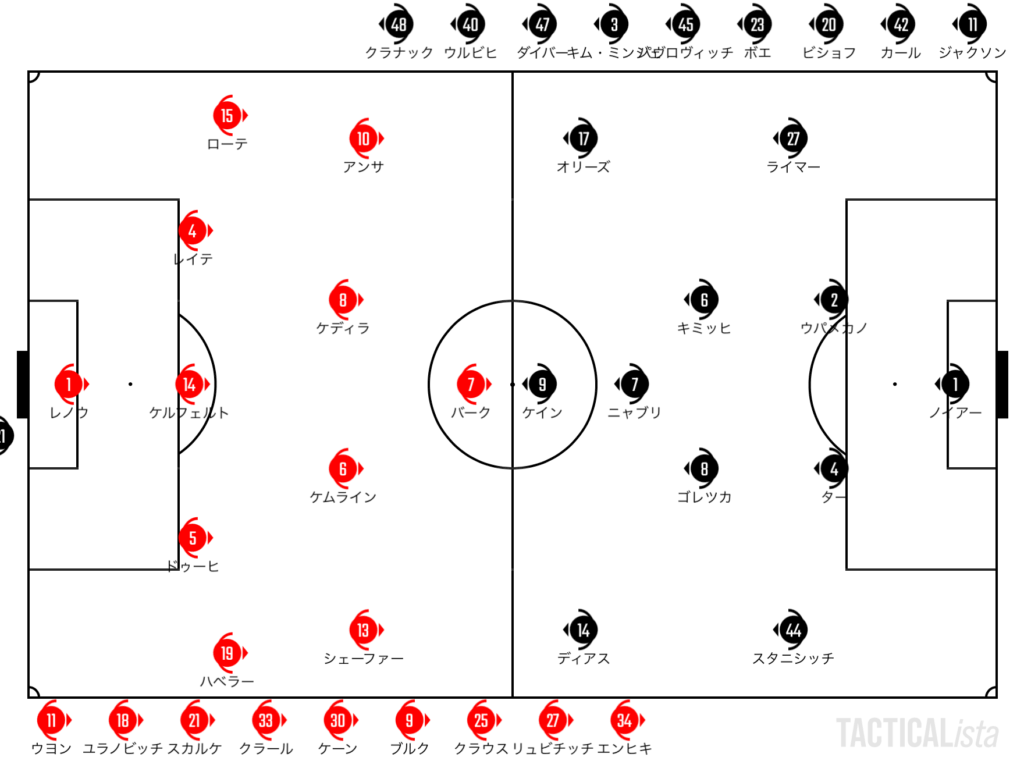 ダイレクトな形でもなかなかチャンスを作れずに苦戦するバイエルン。頼みのケインも潰されてしまい、なかなかチャンスを作れない。それでも3バックの3枚目を構成する人を入れ替えることでバイエルンはウニオン・ベルリンのマンツー気味の守備を外しにいく。特にターからの配球は効果があった。