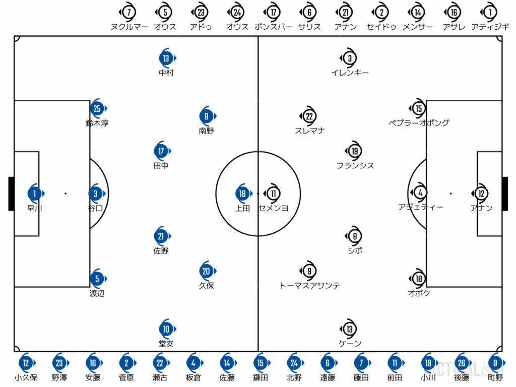 ガーナの保持は日本の噛み合わせに対して真っ向勝負。機を見て前に出ていく上田をスイッチ役として追い込んでいく。特に左サイドに追い込まれてしまうとかなり苦しいところ。前線へのロングボールからなんとか起点を作りたい。スレマナがシンプルな脚力で裏をとりにいくが、それでもなかなかきっかけを作ることができない。