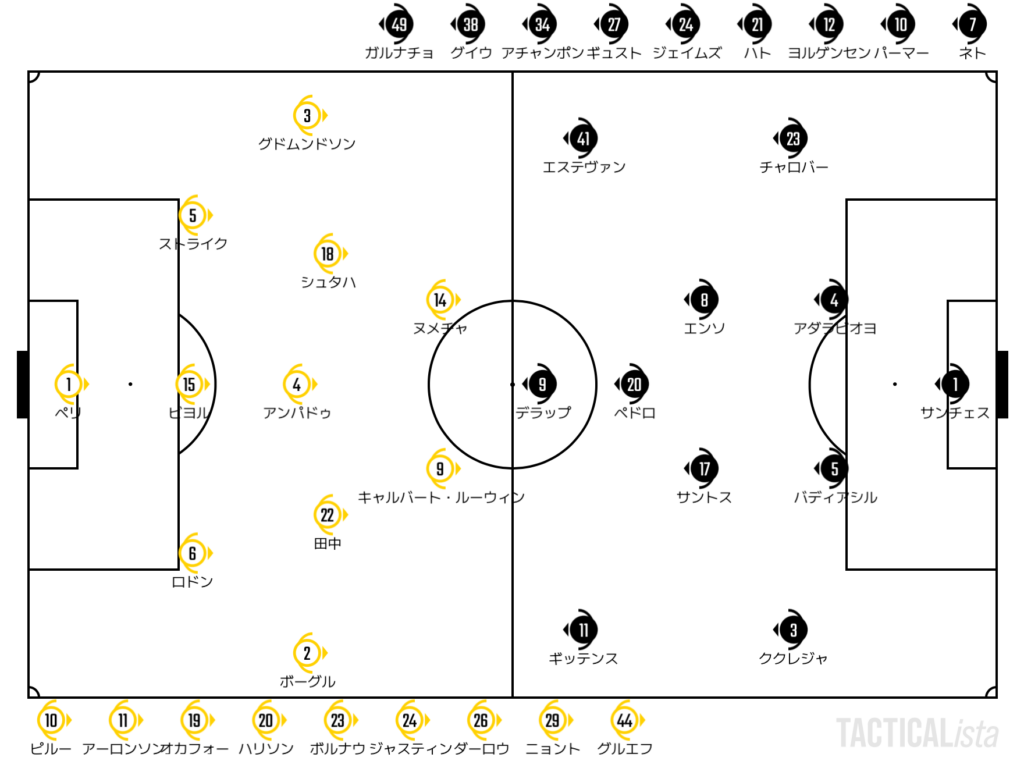 LEE:6′ ビヨル, 43′ 田中碧, 72′ キャルバート=ルーウィン