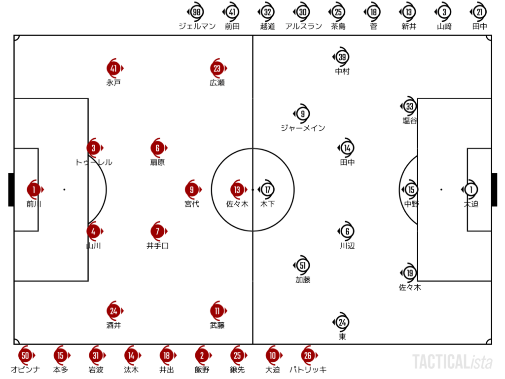 大迫がいない状況で大一番に臨むこととなった神戸。それでも佐々木と宮代をめがけて蹴る格好。受ける側も荒木が出場停止でCBに入る中野の対空性能が試される展開だったが、そこも見事に踏ん張って見せた。