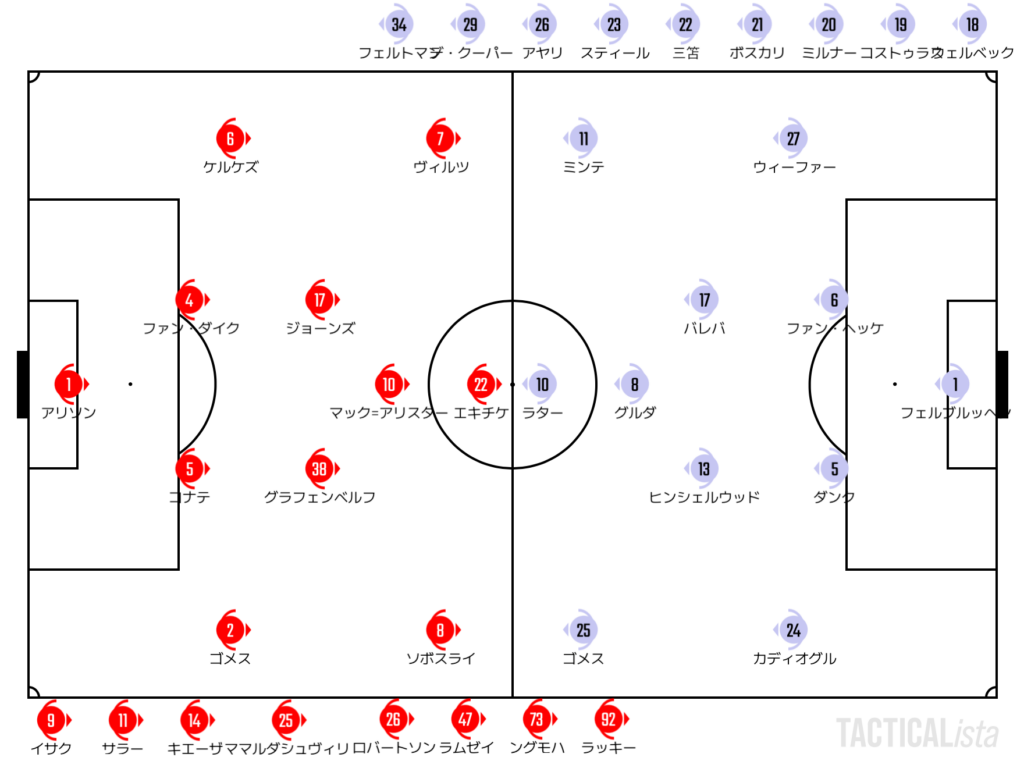 保持局面が安定していたリバプールはゴメスの負傷にも冷静に対応。サラーが入ってからは右の大外をサラーに託す形に変更し、引き続き浮いた中央からチャンスを作っていく。ヴィルツのアクションは板についており、ほかの選手が上がるアクションと噛み合わせて中央突破ができるなど、少しずつなじんでいく様子を見せた。
