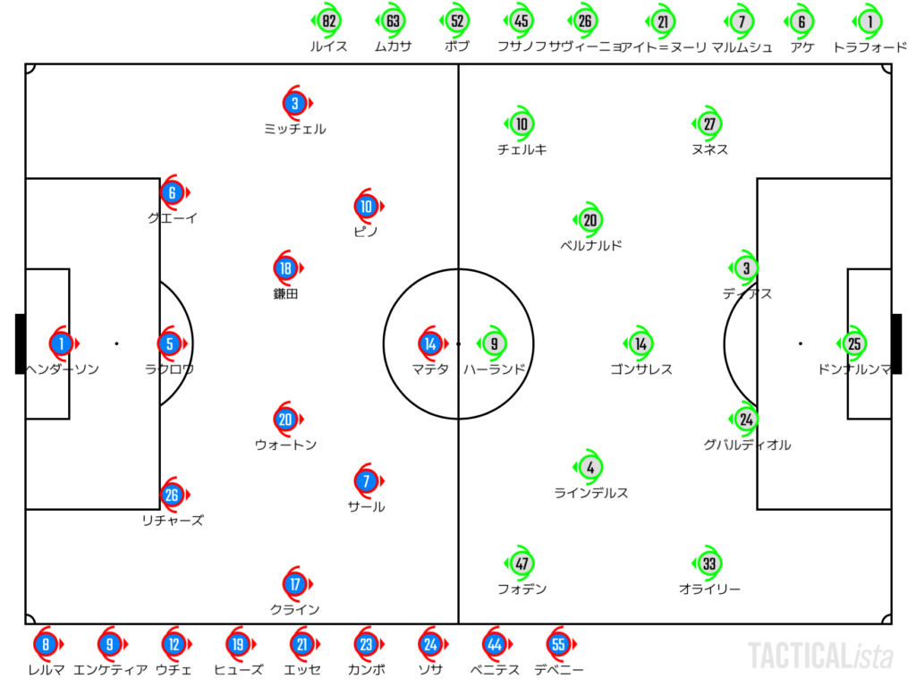 だが、ワンチャンスからシティは先手を奪う。ヌネスが上げたクロスに対してリチャーズがあまりにもあっさりとマークを外してしまい、ハーランドが高い打点からゴール。一瞬の隙から先制ゴールを生み出し、シティはリードでハーフタイムを迎える。