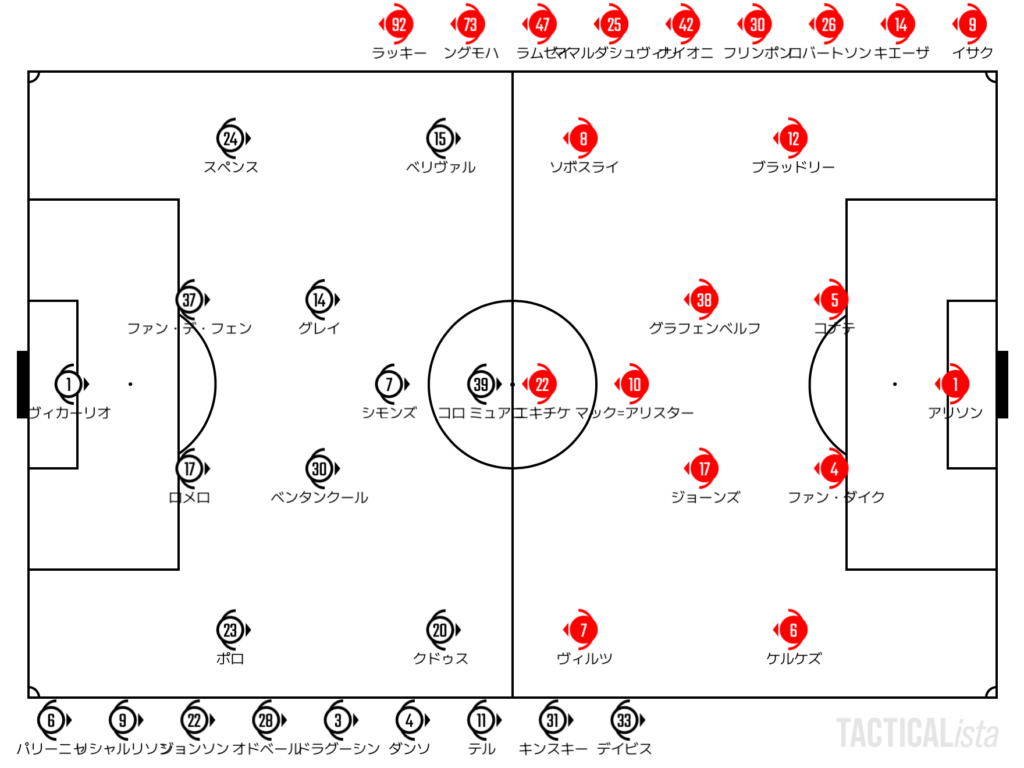 後半、リバプールはイサクを投入。2トップにシフトする形で攻勢を強めていく。クロスのターゲットが2枚になったことでカジュアルに敵陣に迫れるリバプールは56分に先制。イサクの左足からゴールを生み出す。だが、このプレーでイサクは負傷。リバプールは再び1トップに戻す形に。
