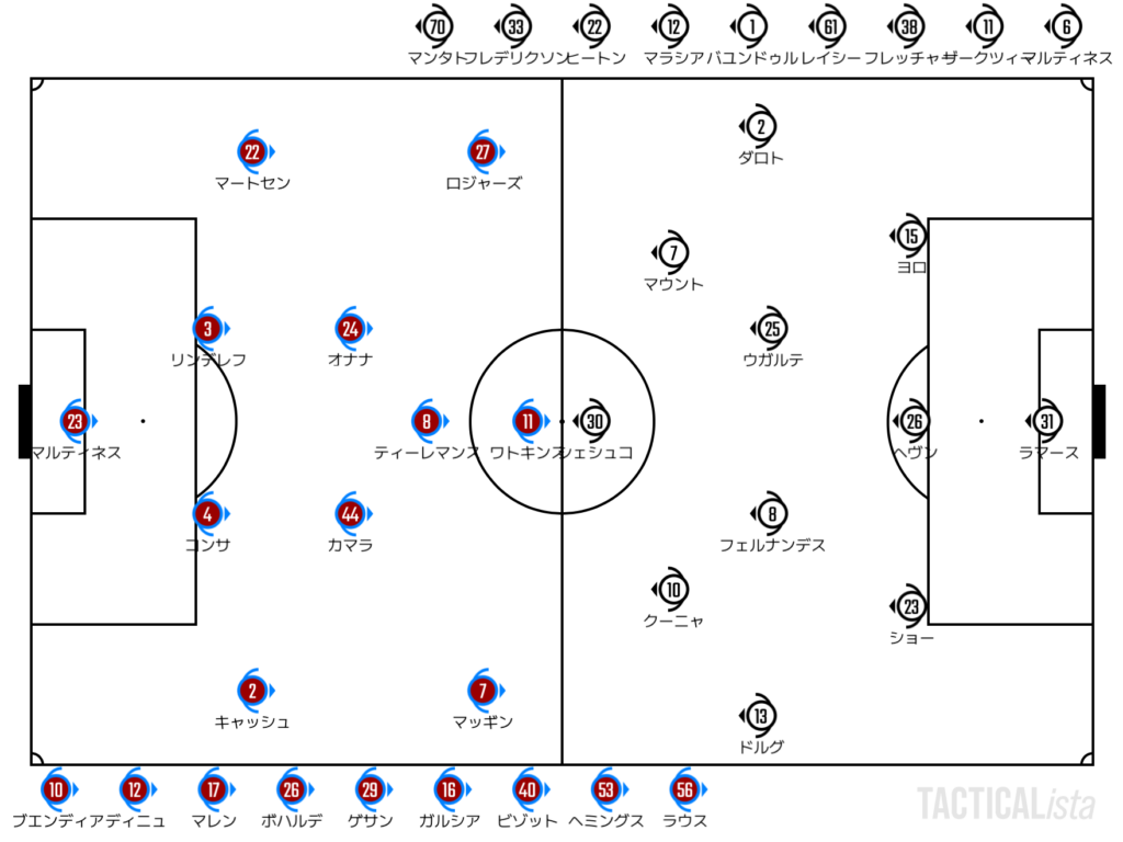後半、ユナイテッドはブルーノに代えてリサンドロ・マルティネスを投入。中盤のフィルターの機能性は上がった一方で配球では中盤でボールを引っ掛けてしまうなど苦戦が続く。