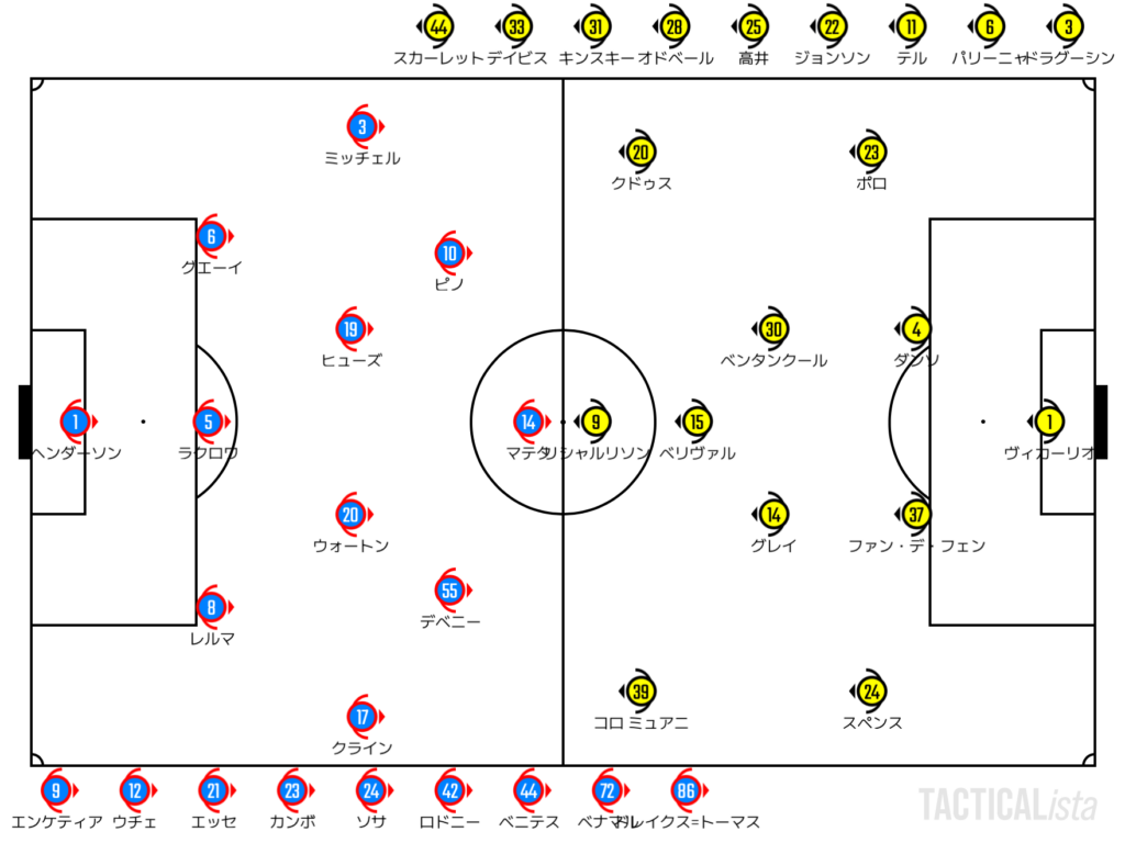 一方のトッテナムはパレスのハイプレスに苦戦。マンツー気味に出てくるパレスに対してつなぎの活路を見出すことができず。パレスはポゼッションとハイプレスの両面からチャンスメイクに成功。マテタの反転からの加速でチャンスを迎えるなど、少しずつ有効打が。ボックスでの競り合いになればトッテナムのDFに対して優位が取れることもあるパレスはゴールにだんだんと迫っていく手応えを手にしていく。