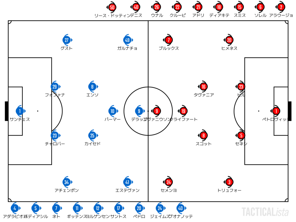 しかし、チェルシーはすぐに反撃。右サイドからの攻撃の組み立てに成功するとセメンヨがPK献上。際どい接触であったが主審の選択はPK。このPKをパーマーが仕留めてチェルシーは試合を振り出しに戻す。