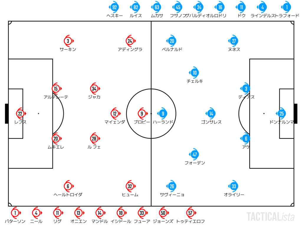 難しいシティはドクを投入。左サイドに定点攻撃が機能する場所を作る。サンダーランドはヒューム、ジャカなどが枚数調整役となり時には5バックにシフトしながら対応する。ロドリも左のハーフスペース周辺からロブ性のボールをファーに置く形からチャンスメイク。さすがの視野と正確な配球力でチャンスを作っていく。