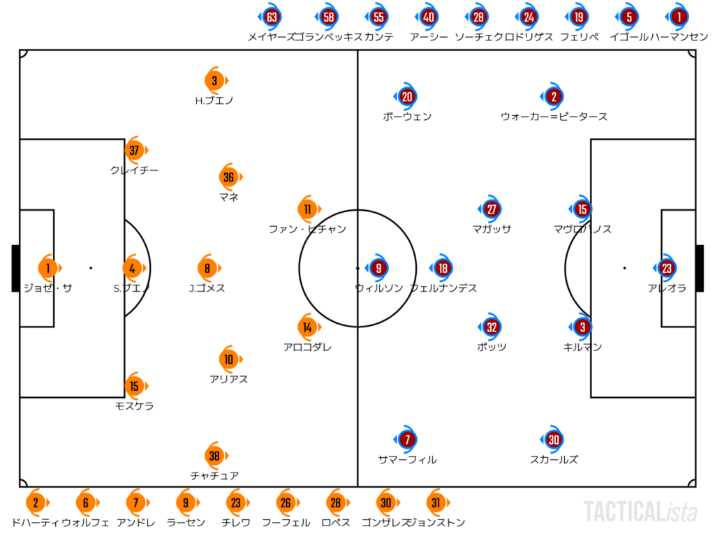 この左サイドの連携からウルブスは先制。マネとヒチャンのコンビネーションから奥を取ると、マイナスの折り返しをアリアスが仕留めてゴールを決める。ウェストハムは総じてホルダーとの距離が遠く、ドリブルを仕掛ける起点でやられ放題。このシーンでマガッサが強引に捕まえに行った失敗が最後まで尾を引く格好に。後手後手に回り、最後はフェルナンデスのサボりを咎められしまった。