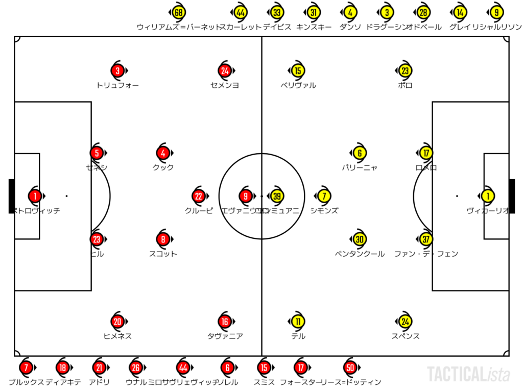 両チームとも縦に勢いがある状態からスコアを動かしたのはボーンマス。タヴァニア→エヴァニウソンのクロスから同点。トッテナムのCB陣はタヴァニアの鋭いクロスに対してリアクションをすることができなかった。