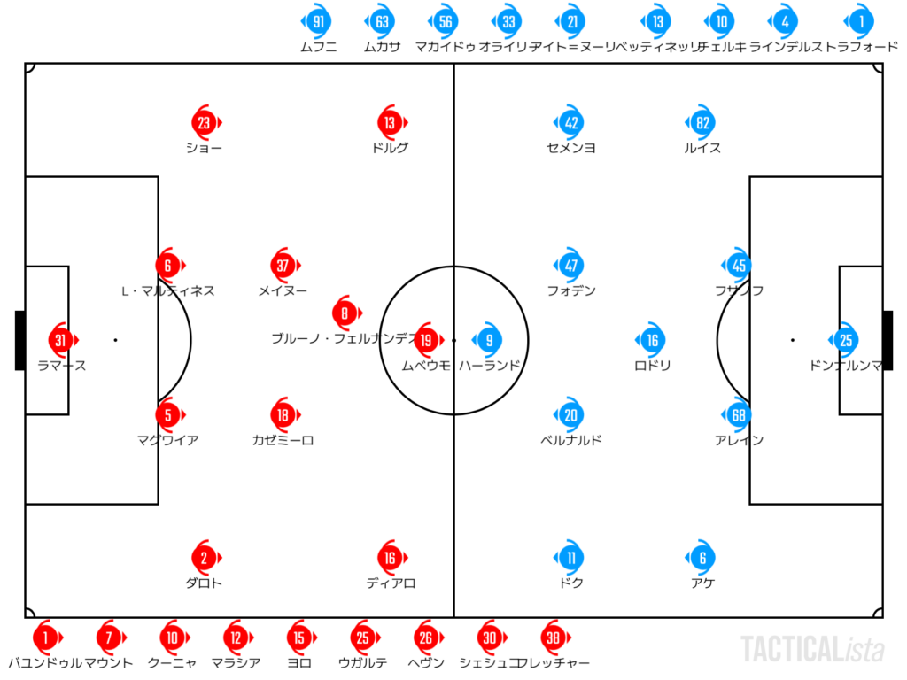 ドンナルンマの奮闘でなんとか踏ん張るシティだが、ユナイテッドはついにセットプレーからのカウンターで勝ち越し。フサノフが動くまでリリースを待つことができたブルーノのエスコートでムベウモがドンナルンマを打ち砕いた。シティは前半から良くなかったセットプレーのキックの精度と中盤のすれ違いがついに失点という形で爆発してしまった。