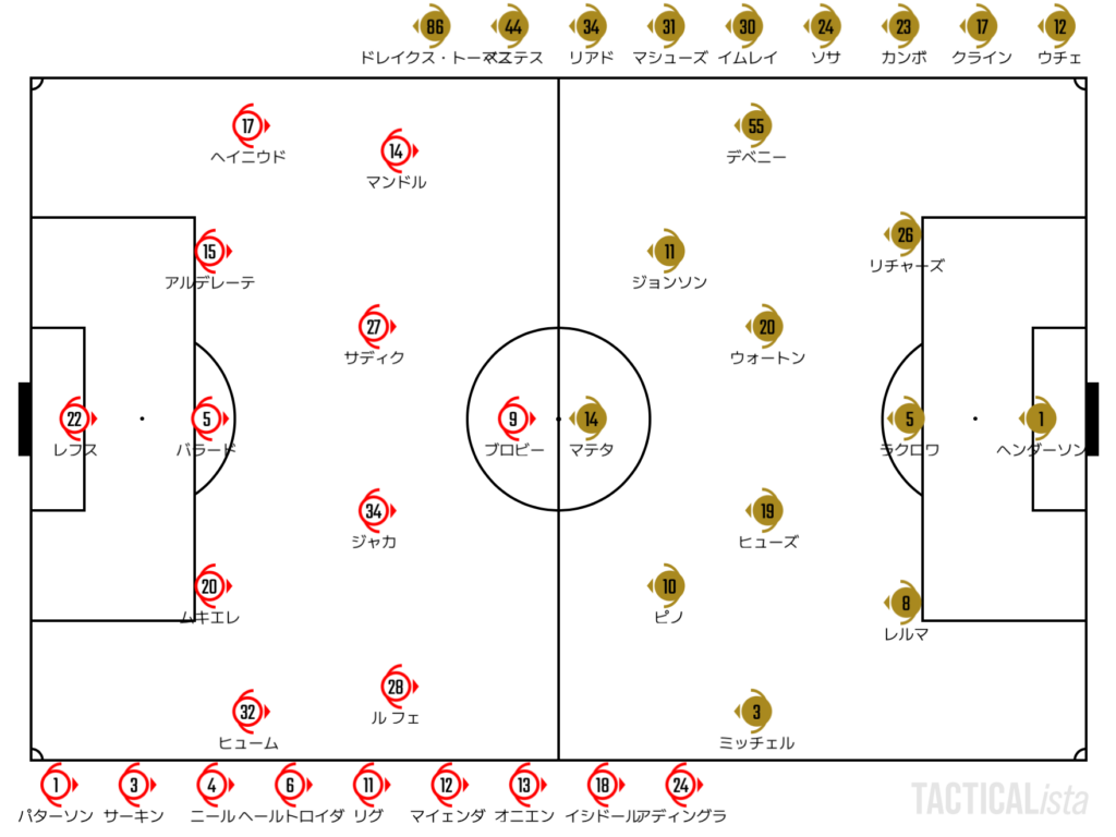 先制点はやや意外な形。セットプレーからピノのゴールは少し見ている側としても外されたような感じ。どちらかというと押し込まれた側のパレスが先に試合を動かす。