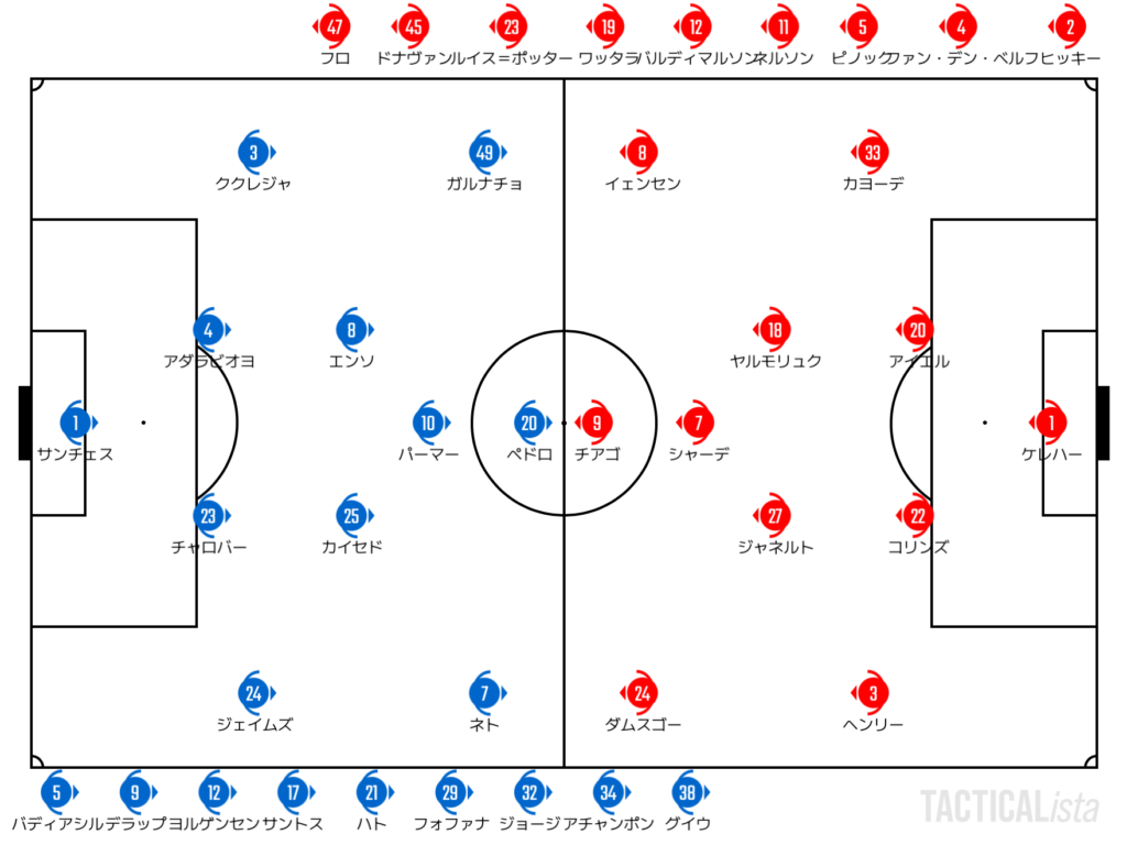 序盤からカヨーデの右サイドを抉る攻撃を耐えたチェルシーは少しずつポゼッションを増やしていく。今日の陣形はSBがほんのりとポジションを動かす形。ジェームズはインサイドに絞っていく。ネトは大外に張るケースが少なくないので、彼のサイドのSBは幅をとらなくてもいいタスクなのかもしれない。
