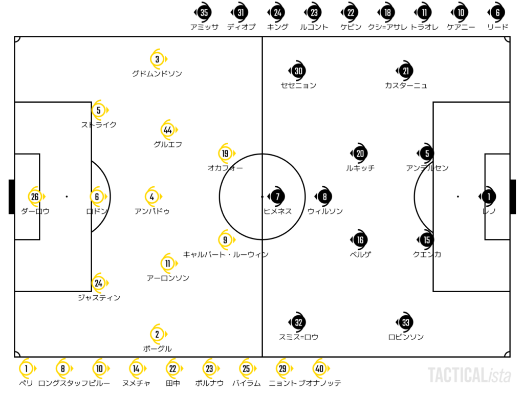 フラムも少しずつリトリートをすることで試合は序盤から変容。ラインを下げることできっちりとスペースを消すような対決にシフトする。