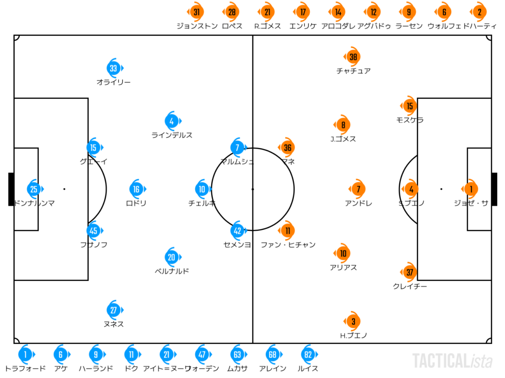 少し流れが変わったのは55分くらいから。高い位置からでのアンドレのボール奪取からのショートカウンターから波状攻撃を仕掛けていく。低い位置からの組み立てでもシティのハイプレスを回避するなど、中盤で優位に立っていく。WBがなかなか仕上げられなかったのが痛恨。ロドリゴ・ゴメスのプレーが悪かったわけではないが、前節のディアロを見てしまうと物足りなさはある。