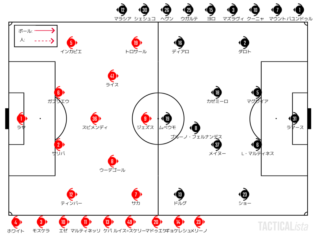 アルテタは直後に4枚交代を敢行。しかしながら、ビルドアップの機能性はなかなか改善せず。高い位置にボールを運ぶことが特に安定した様子はなし。平時から大幅にメンバーを入れ替えた影響もあり、ユニットでのサイド攻撃も機能性を出せない状態が続く。