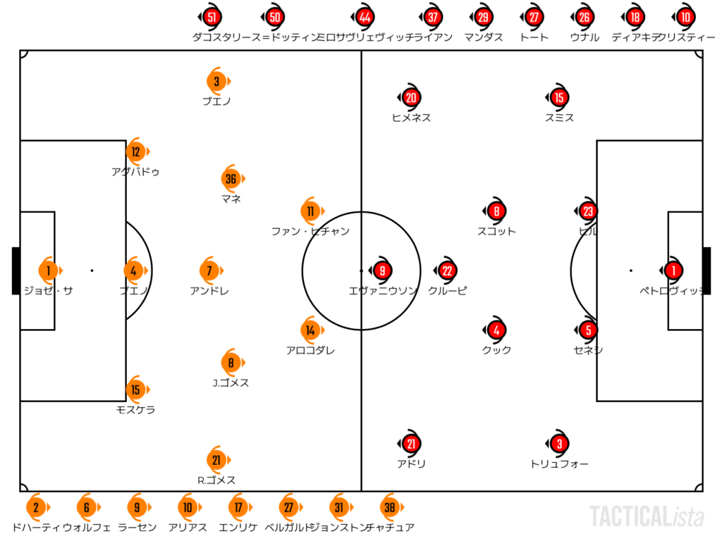 それ以外にウルブスが意識していたのは攻撃の機会を確保。とにかく前線にボールを当ててポストから背後を狙うアクションを繰り返しながらスピーディに攻撃を繰り返していく。アタッキングサードにおいてもマネがシュートを積極的に狙っていくなど、ゴールに向かう意識も悪くはなかった。