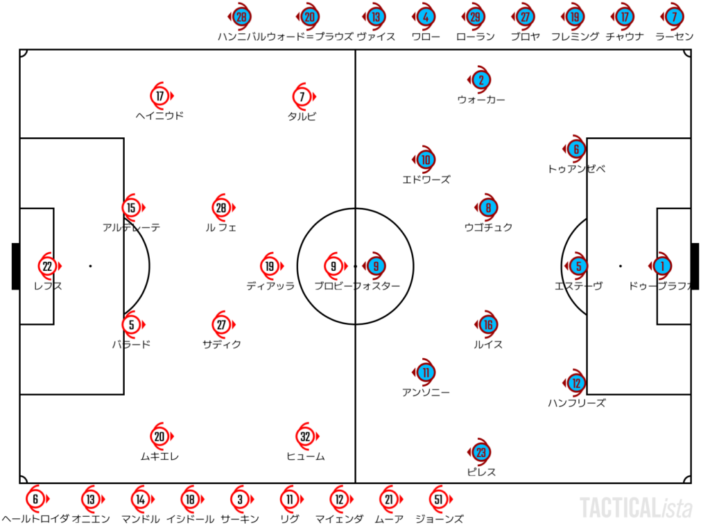 保持に回ってもブロビーのポストプレーや左サイドのタルビなど個人技を活かした陣地回復が安定。バーンリーに特に苦しめられることなくスムーズに前進する。