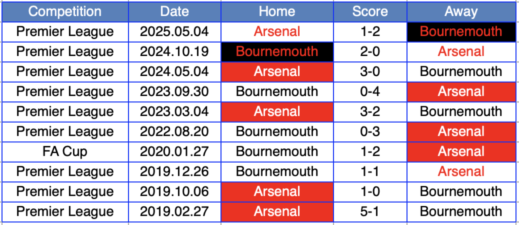 過去9回の対戦でボーンマスの2勝、アーセナルの5勝、引き分けが2つ。