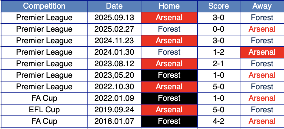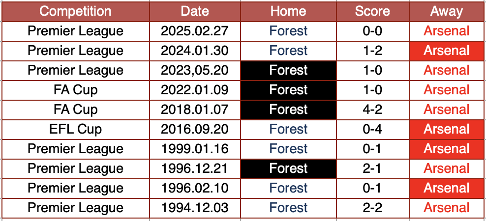 過去10回の対戦でノッティンガム・フォレストの3勝、アーセナルの6勝、引き分けが1つ。