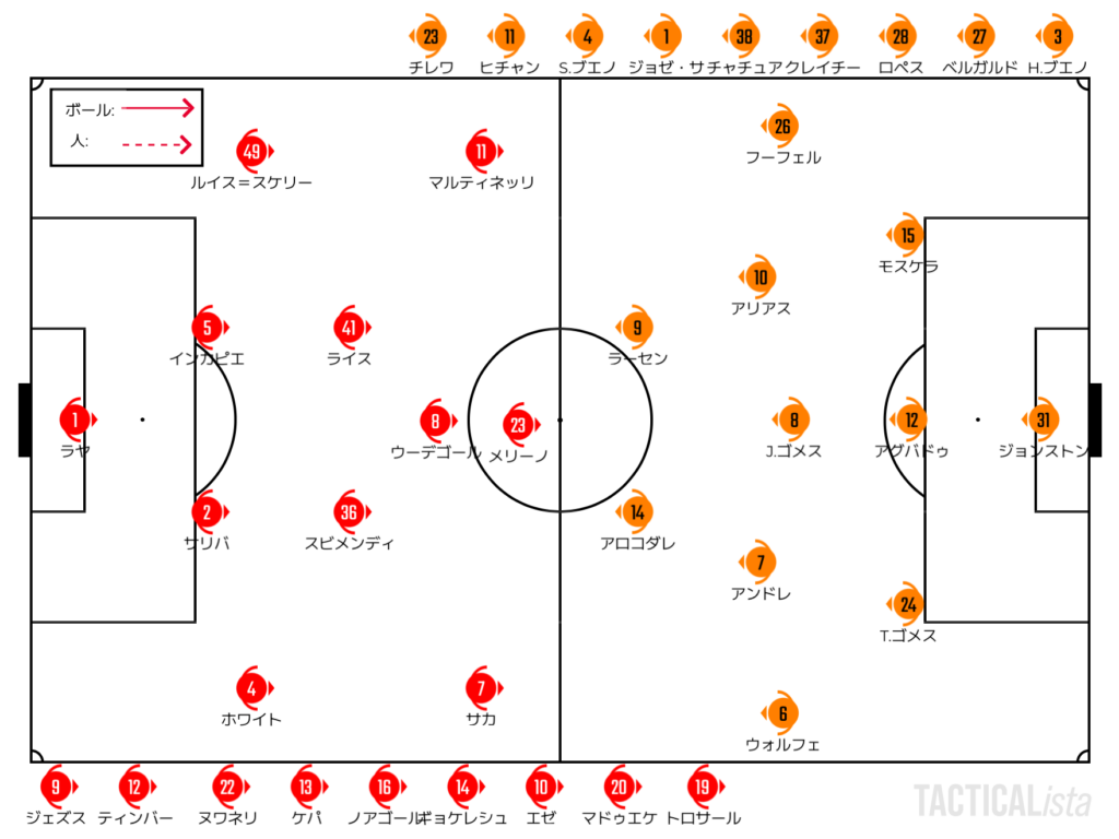 - アーセナルの今季はじめの17のゴールのうち、12はセットプレーから来たものであったが、バーンリーでヴィクトール・ギョケレシュが決めて以降の11ゴールは全てオープンプレーで決めたもの。