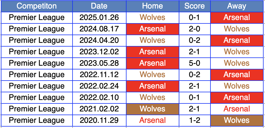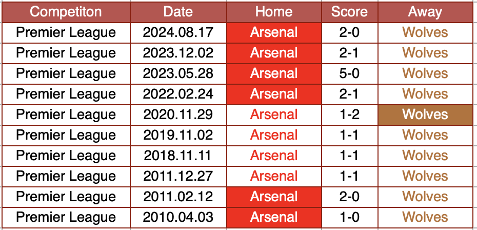 直近10試合の対戦でアーセナルの6勝、ウォルバーハンプトンの1勝、引き分けが3つ。