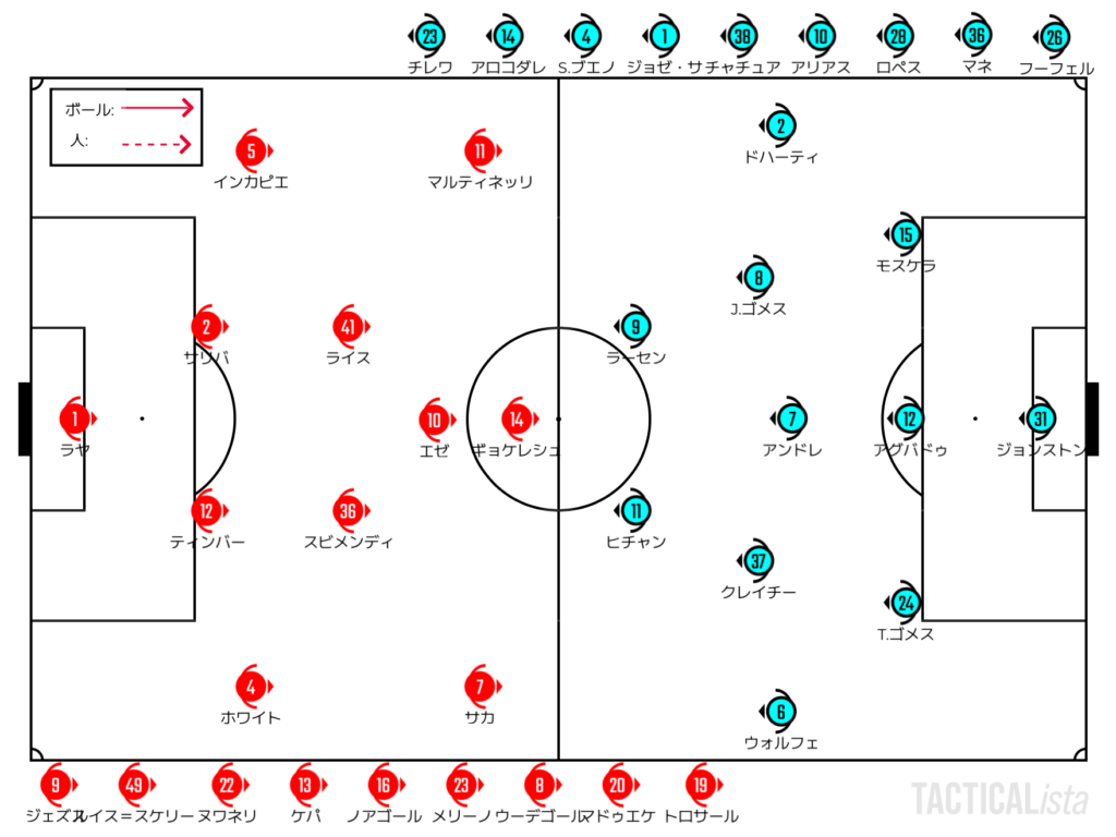 左サイドは引き続き苦しさの中にある状態であったが、マルティネッリは交代直前にデハーティとの入れ替わりからサイドをえぐることに成功。最後に意地を見せた。決まっていれば完ぺきだったけども。