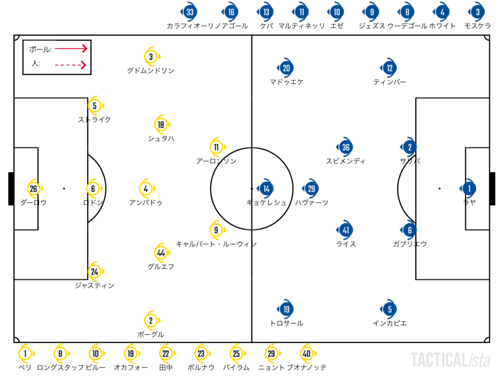 ARS:27′ スビメンディ, 38′ ダーロウ(OG), 69′ ギョケレシュ, 86′ ジェズス