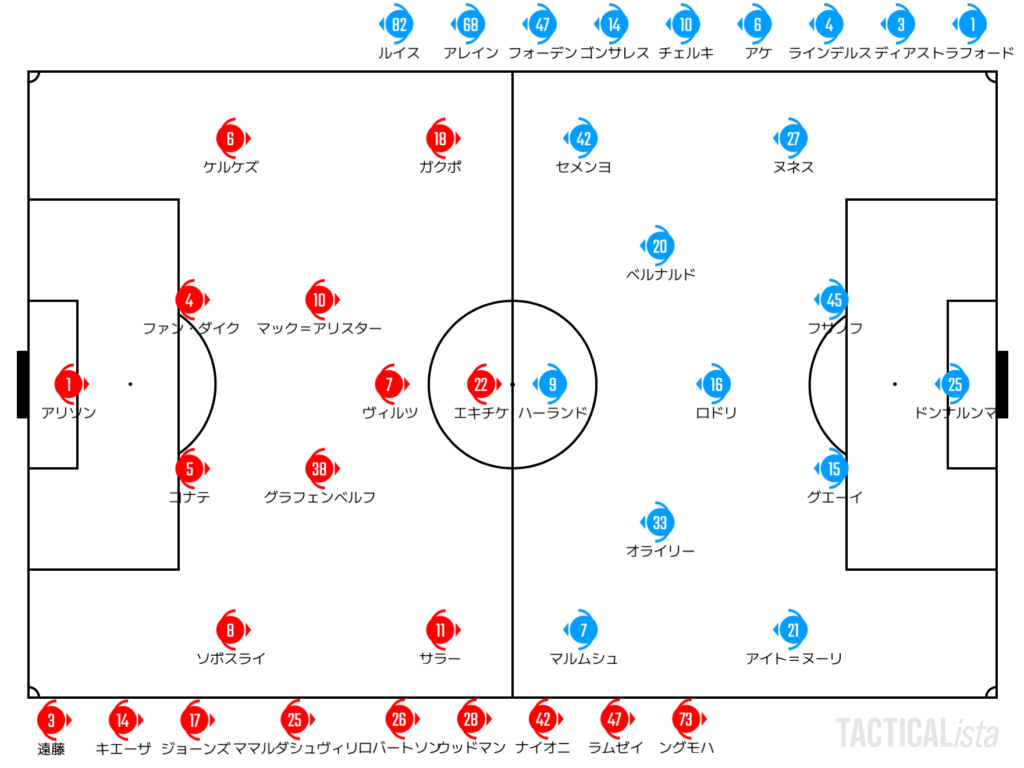 一方のリバプールも同じように長いレンジのパスを差していくが、パスを差した後の前進の精度が欠けている。シティの勢いを削ぐことには成功したが、自らの勢いを出すところまでは辿り着けなかった印象だ。