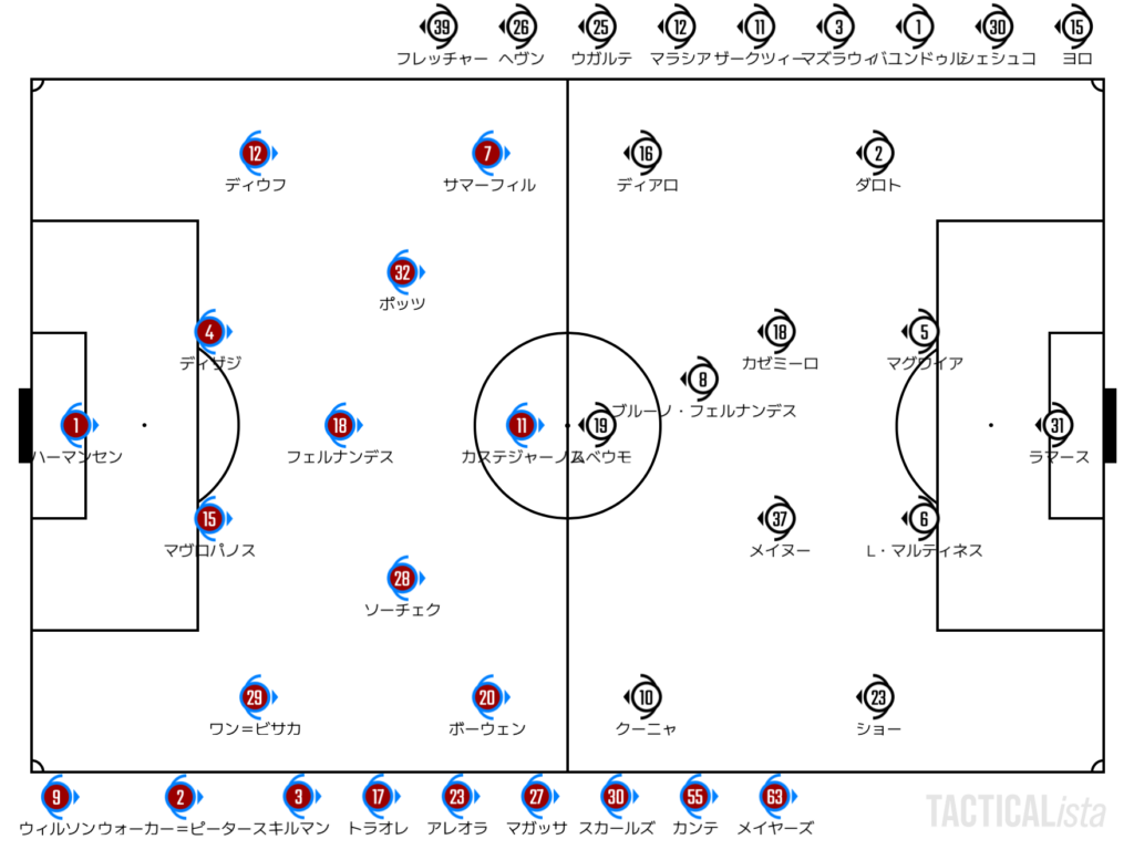 押し込まれる頻度もそこそこにあったマンチェスター・ユナイテッドは丁寧に段差を作ってのカウンター。外循環から安定したポゼッションも絡めながら相手のペースに流れることを許さない。ジリジリとした展開の中で試合はハーフタイムを迎える。