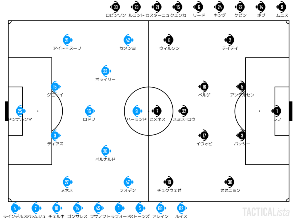 序盤からボールを持つのはシティ。4-4-2でミドルブロックを組むフラムに対して、いつもと同じ攻めのバランスで立ち向かう。左ワイドのセメンヨはセカンドストライカー的な運用だ。ただ、この試合で効いたのはむしろ右サイド。ハーフスペースをつくシンプルなアタックが非常に効いていた。