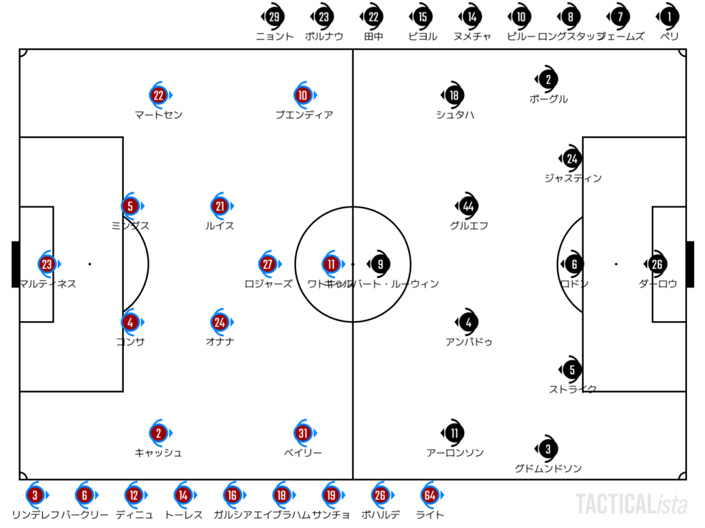 ポゼッションするアストンビラはサリーで中盤をブロックの外に逃がしつつ裏にボールを蹴りこんでいく。しかし、この試みは延々とオフサイドに阻まれてしまう格好に。ワトキンスはなかなかボールに絡むことができずにストレスをためていく。
