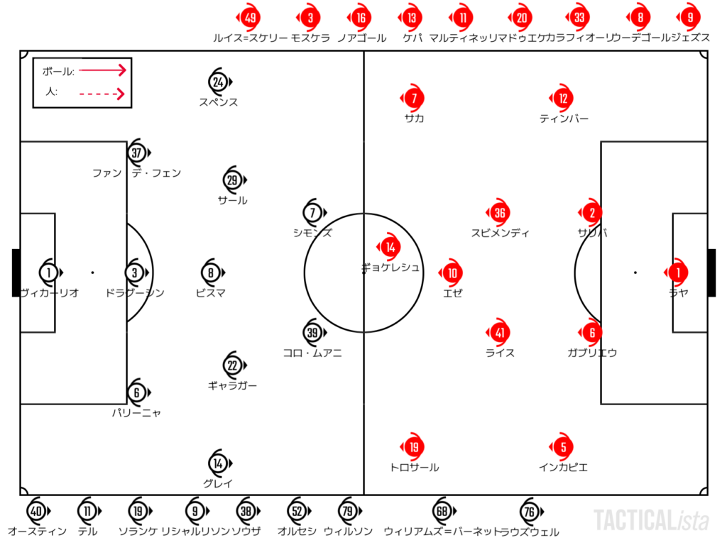 それでも両チームの間には差があったといえるだろう。ハイプレスからミスを誘発する以外はなかなかルートを作れないトッテナムに比べれば、アーセナルの前進は多様。先に挙げたプレス回避からの横断に加えて、ギョケレシュへのロングボールから前進を狙っていく。