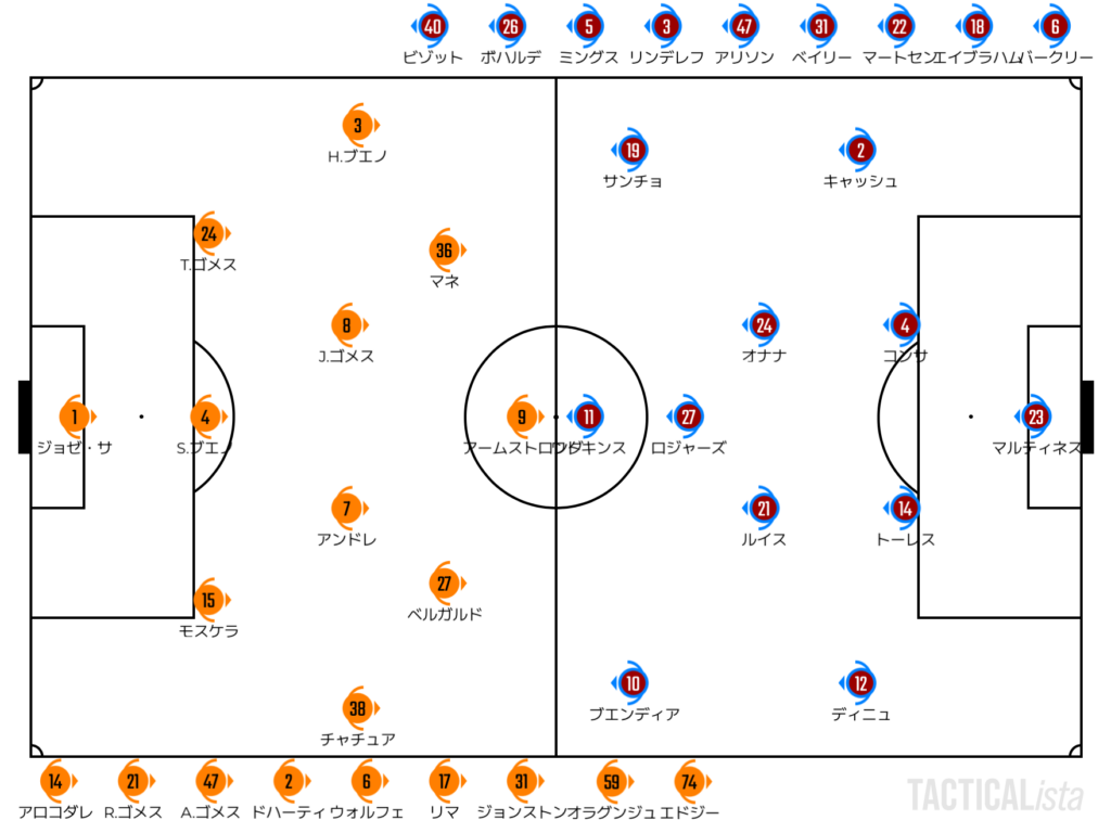 だが、まずかったのは非保持。ウルブスの攻撃に対して、マーカーは存在するものの距離が遠いせいで実質フリーの状態でのプレーを許す。まさに先制点のジョアン・ゴメスの得点はその好例。ウルブスは延々とフリーの選手を繋ぐだけで横断からフィニッシュまで完結することができた。