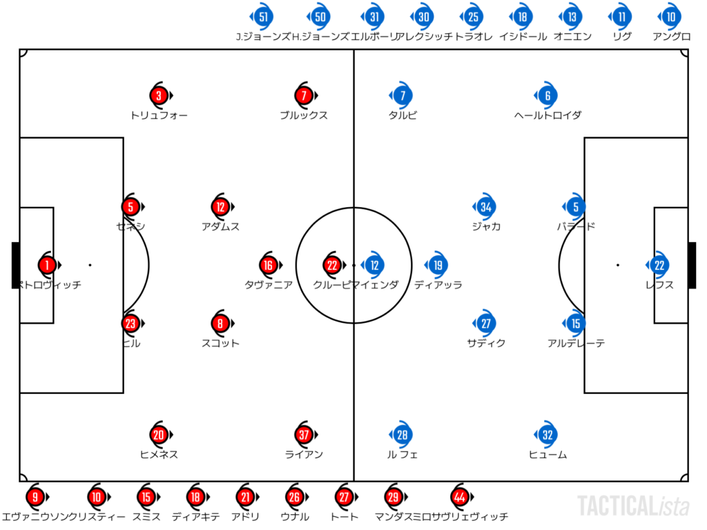 後半もジャッジは不安定。アダムスのタックルはかなり深く入ったように見えたが、主審の提示はイエローカードでVARもOFRをレコメンドしなかった。