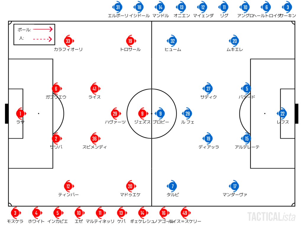 下がってのゲームメイクの役割が薄かったハヴァーツはどちらかといえばファイナルサードに特化気味の役割。特に左サイドからのクロスにはきっちり飛び込む意識が高かった。CFのジェズスはアタッキングサードでPA幅の外に出るプレーがギョケレシュやメリーノよりも多いので、そういう時にストライカーとして振る舞うことができるハヴァーツの方が相性がいいと考えたのかもしれない。