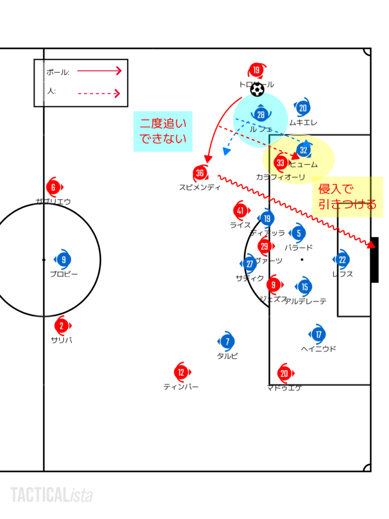 だが、この日はウーデゴールは不在ということでこの位置に降りてくる機会が多かったのはトロサール。低い位置までボールを引き取りにいくウーデゴールロールをハヴァーツの代わりに敢行。その動きをきっかけに逆サイドまで顔を出すなど、かなりフリーマン的な役割が見られていた。