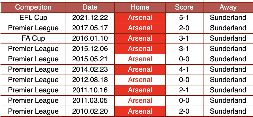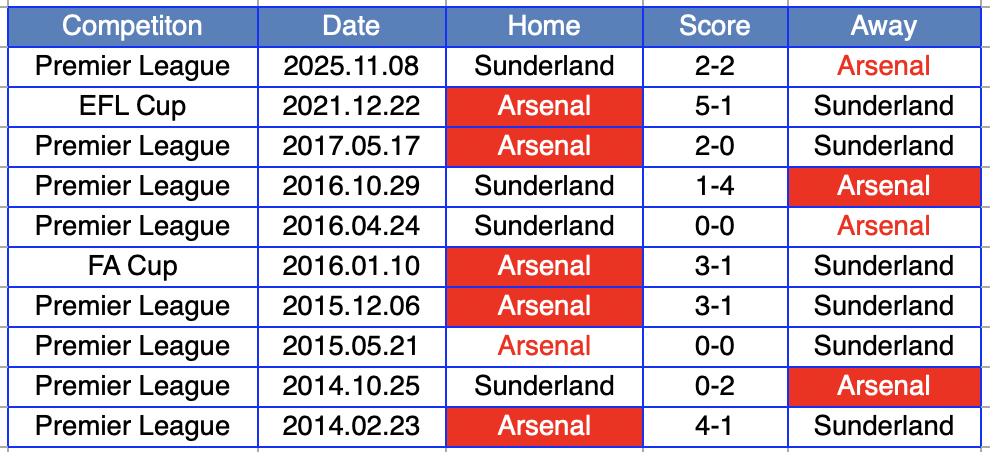 - サンダーランドは直近28回のプレミアでのアーセナル戦で1勝のみ(D10,L17)。唯一の勝利は2009年11月のホームでの勝利。