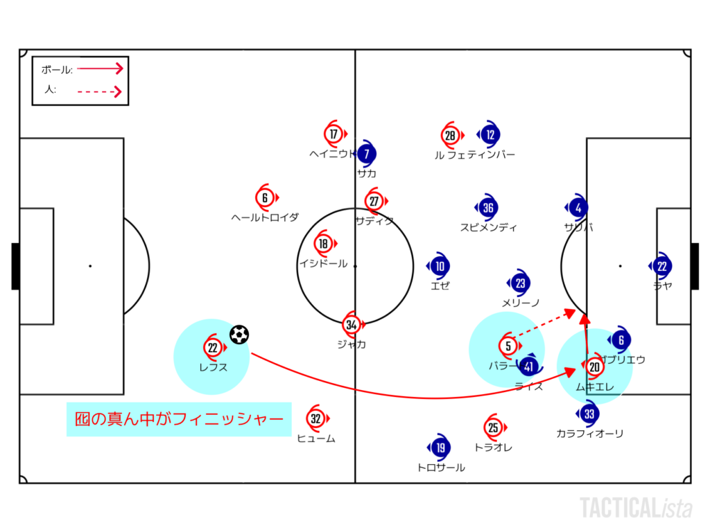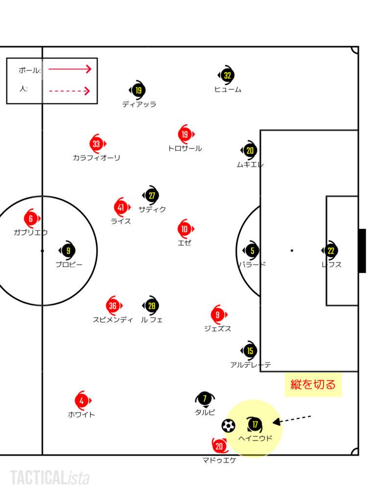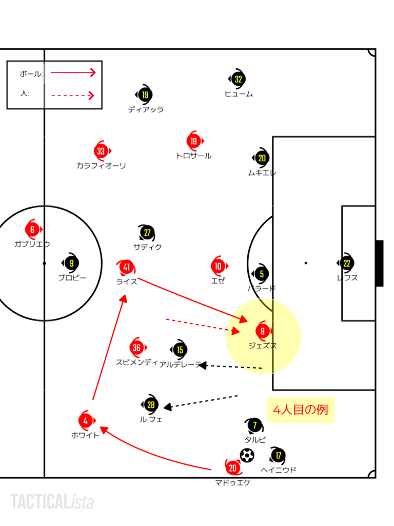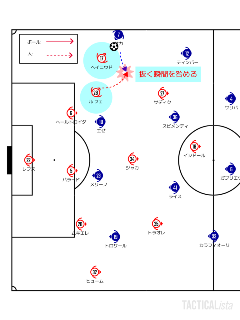 アーセナルとしては3人目、4人目が崩しに絡むことができるかが指標の一つ。ダブルチームに来るということはどこかが必ず空くはずなので、パスを回しながらそこを探りたい。WBの背中をワイドのCBがケアできない状態でハーフスペースに突撃するのが理想である。