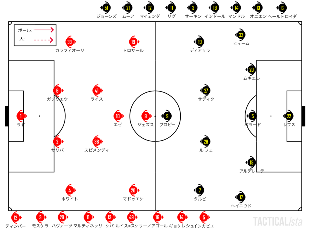 前回対戦の際にもブロビーへのロングボールは効いていたが、この試合では負けている状態で2トップに移行するという捨て身の状態であったことは気に留めておきたい。右のSHにFWカラーの選手を入れる疑似的な2トップで来る可能性もあるが、基本的には試合の頭はターゲット1枚でスタートする可能性は高いはず。前回のスクランブルな対応とは少しテイストは変わる可能性がある。アーセナルとしてはガブリエウとサリバの連携からブロビーにラインを下げさせられない展開を作りたい。