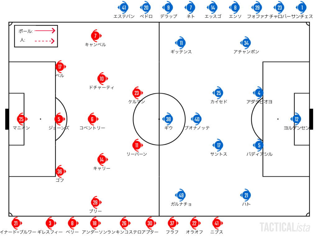 ボールを持つのはチェルシー。3-2-5という陣形自体は前任者と同じ。2CHはそのままサントスとカイセドでキープしつつ、LSBのハトがブオナノッテと左右対称の位置にいることでライン間に入り込んでいく。