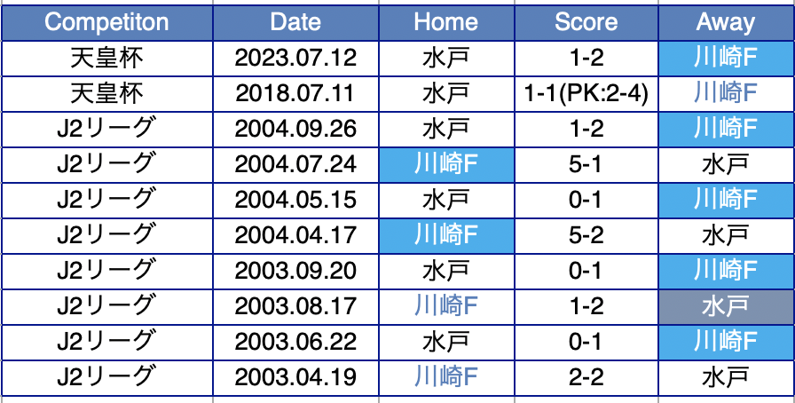 直近10回の対戦で川崎の7勝、水戸の1勝、引き分けが2つ。