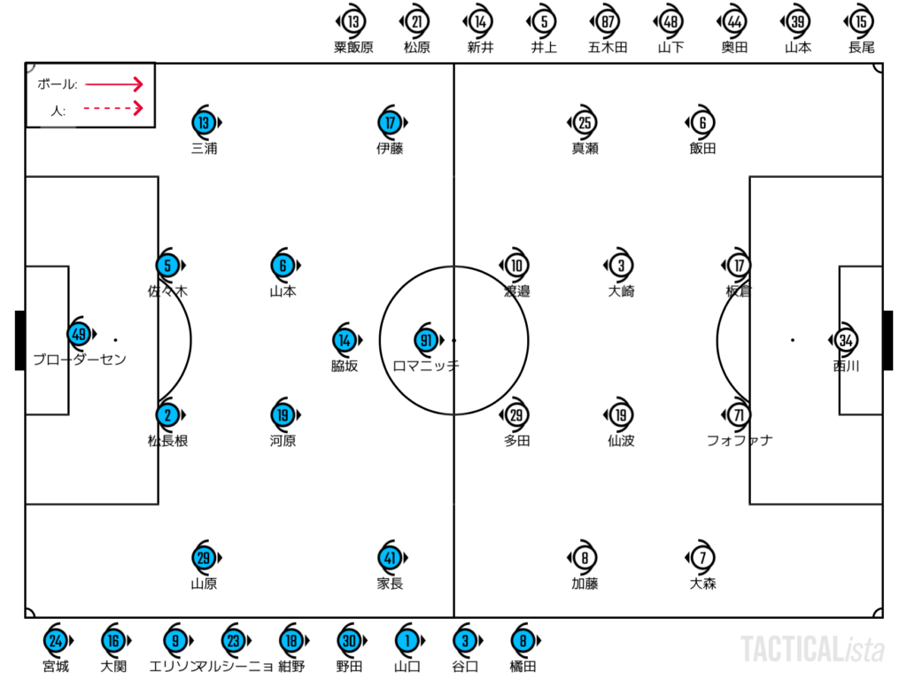 CHは縦関係気味。ギャップを作りながら縦パスを入れて進んでいく。広島からレンタル中の仙波は特にフリーにすると面倒な相手。ドリブルから相手をはがすこともできるし、トランジッションから相手のDFラインの裏にタッチダウンパスを決めることもできる。町田戦では自らがボックス内に飛び込んでのシュートも決めている。