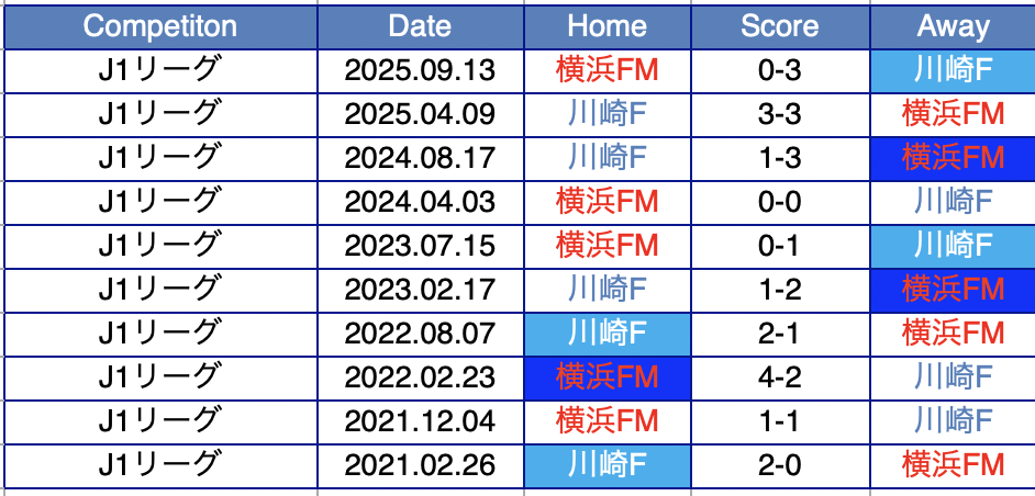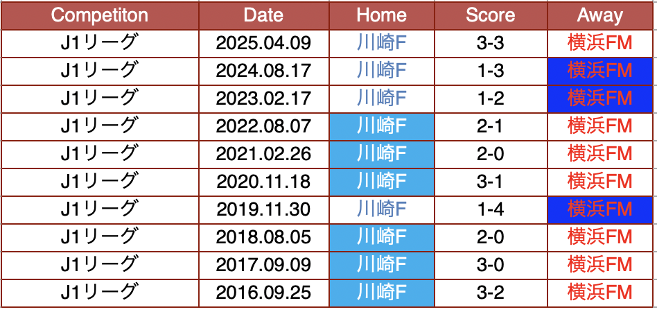 • しかし、直近3試合の川崎のホームゲームに限れば横浜FMが無敗(W2,D1)