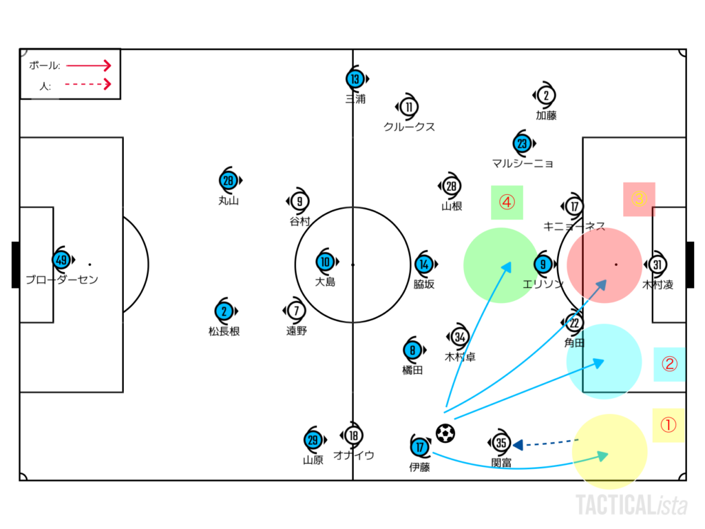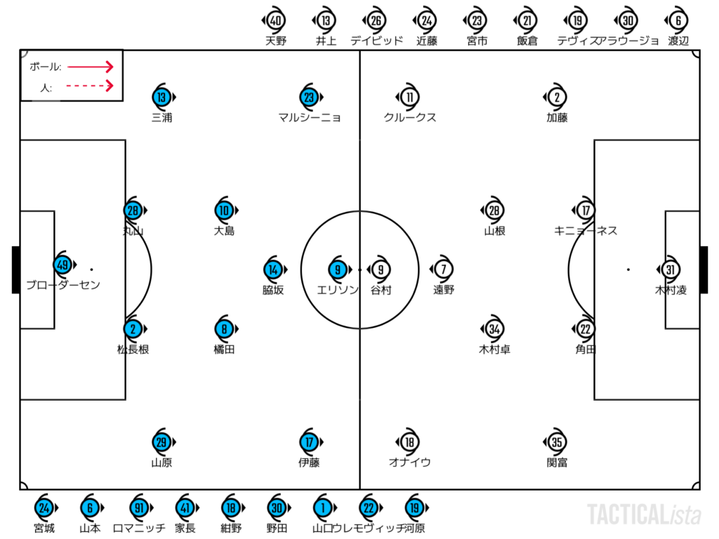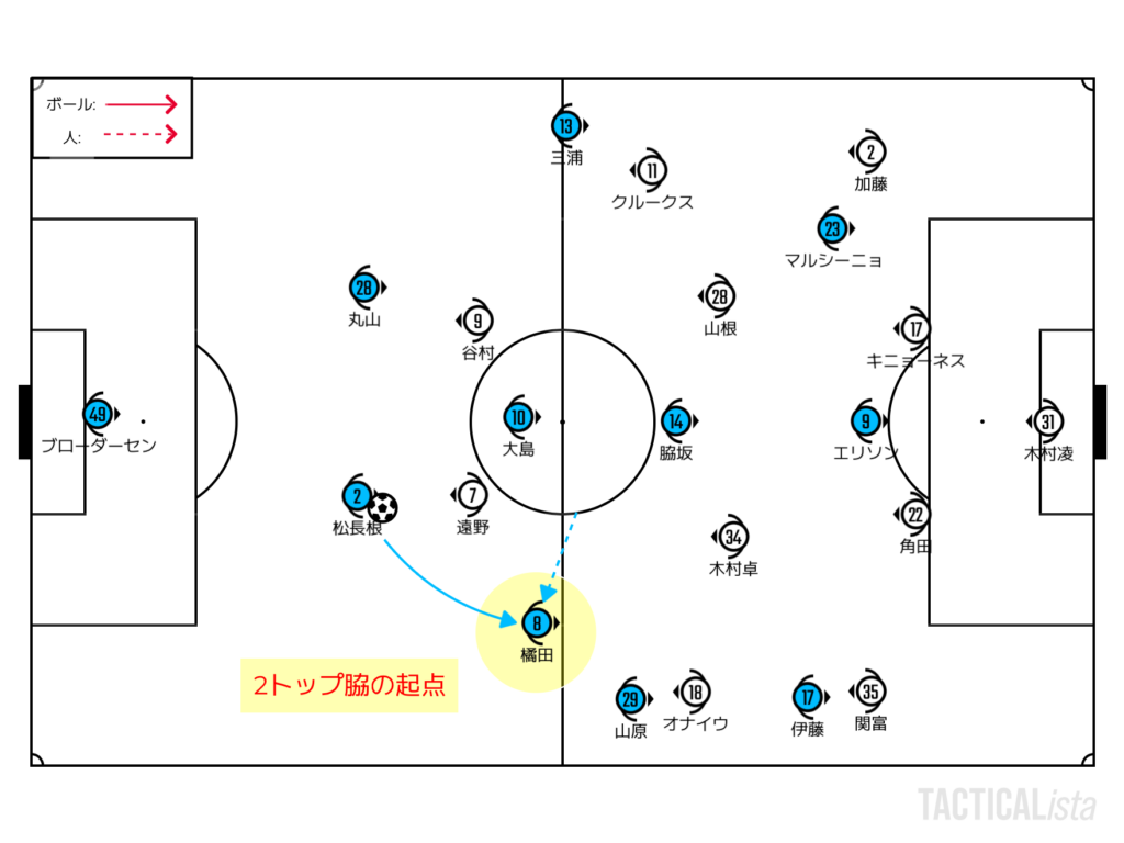基本的に相手のSHをピン留めするか引き出すかの2択によって攻略のイメージは変わってくる。どちらのルートでも大事なのは、必ず1人のCHは横浜FMの2トップの間で背中を取ることで立ち位置を守ること。FC東京戦が顕著だったが、この1人がいることによって相手の2トップの守備の可動範囲は大きく下がる。4-4-2ブロック攻略から4-4攻略に移行できれば負荷は下がる。