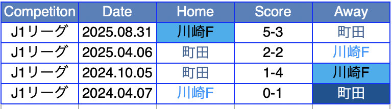 - 初対戦で負けて以降、川崎は町田戦で3試合無敗(W2,D1)